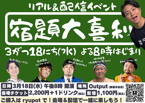 ★宿題大喜利・開場:19時30分/開演:20時・出演=知念だしんいちろう、金城晋也(リップサービス)、松田しょう(初恋クロマニヨン)、仲村昭吾(太陽君とそよ風ちゃん)、あゆむ(ノーブレーキ)・会場=ライブハウスoutput