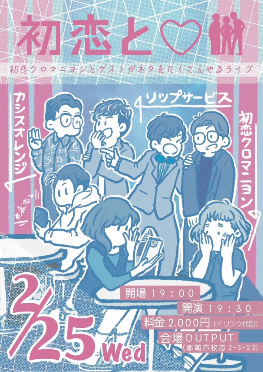 ★初恋と♡ 初恋クロマニヨンとゲストがネタをたくさんやるライブ・開場:19時/開演:19時30分・出演=カシスオレンジ、リップサービス、初恋クロマニヨン・会場=ライブハウスoutput
