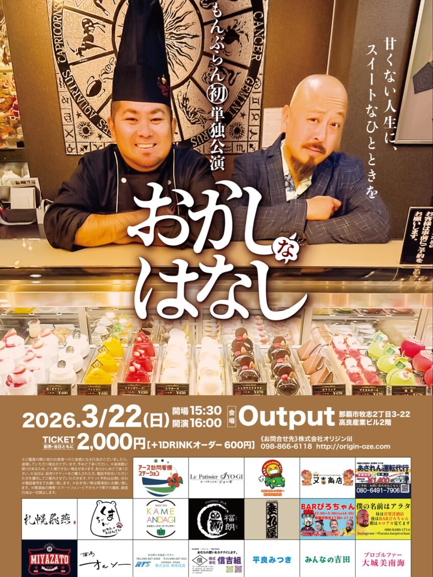 ★Output LAUGH PROJECT アベンジャーズ SPECIAL 2026・開場:12時30分/開演:13時・出演=令和ロマン / 家族チャーハン / ラブレターズ / 初恋クロマニヨン / ありんくりん / マルキヨビル ほか・司会:喋ってなんぼ駒井・会場=ライブハウスoutput/桜坂劇場ホールA、/桜坂劇場ホールB