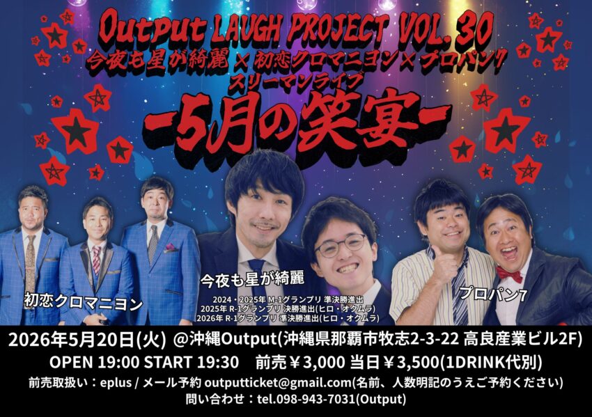 ★Output LAUGH PROJECT VOL.30 今夜も星が綺麗 × 初恋クロマニヨン × プロパン7 スリーマンライブ -5月の笑宴-・開場:19時/開演:19時30分・出演=今夜も星が綺麗、初恋クロマニヨン、プロパン7・会場=ライブハウスoutput
