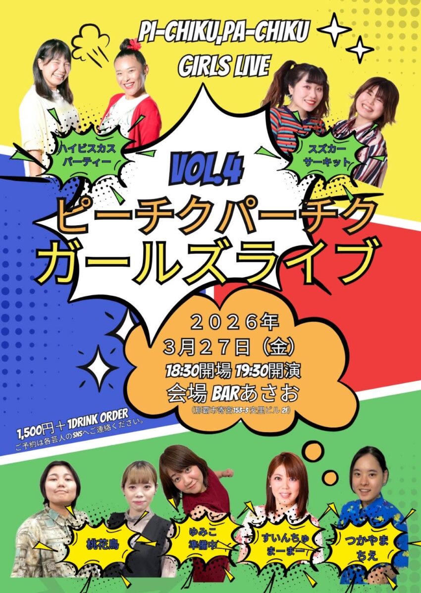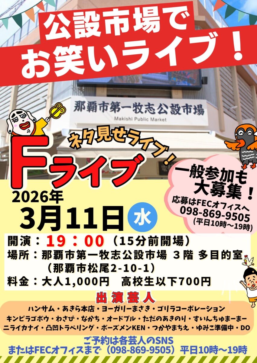 ★ネタ見せライブ・Fライブ・開場:18時45分/開演:19時・出演=ハンサム・あきら本店・ヨーガリーまさき・ゴリラコーポレーションテンピラゴボウ・わさび・なかち・オードブル・ただのあきのり・すいんちゅまーまーニライカナイ・凸凹トラベリング・ボーズメンKEN・つかやまちえ・ゆみ二準備中・会場=那覇市第一牧志公設市場 3階 多目的室(那覇市松尾2-10-1)
