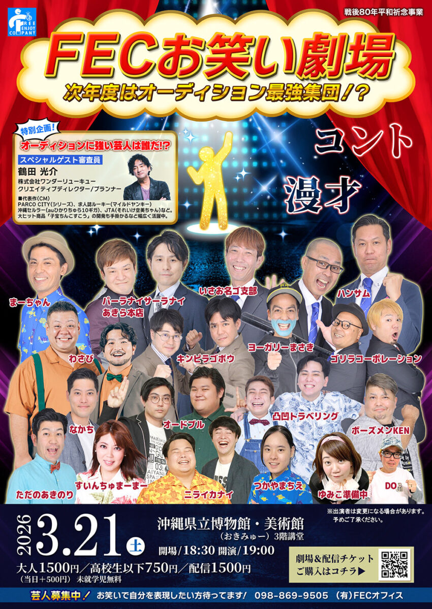 ★宮古島初上陸!新春初笑い!FECお笑い劇場下地イサムさんと一緒!・開場:18時/開演:19時・出演=下地イサム / 護得久栄昇with仲座先輩 / 大兼のぞみ / パーラナイサーラナイ / やぎのシルー / ヨーガリーまさき / なかち / ただのあきのり・会場=宮古島市文化ホール(マティダ市民劇場)