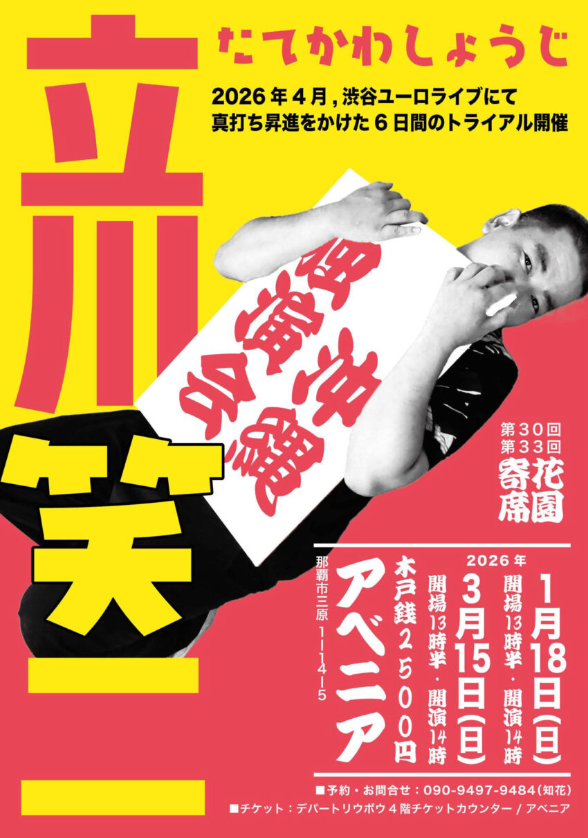 ★琉球大学落語 & お笑いサークル 笑琉拳・開場:17時/開演:17時30分・出演=純金、けむし、カカデペロ、かつかい、チコウ牧場、川村公立中学校・MC:梅田つむぎ・会場=ライブハウスoutput