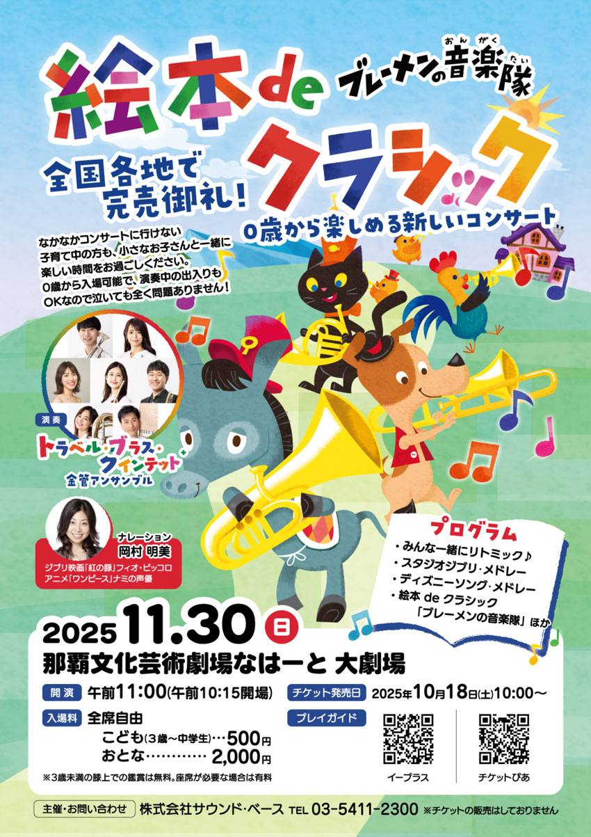 ★絵本 de クラシック「ブレーメンの音楽隊」・開場:10時15分/開演:11時・出演=トラベル・ブラス・クインテット+(金管アンサンブル):曽根麻央(トランペット)、只友佑季(トランペット)、佐藤杏子(ホルン)、山下純平(トロンボーン)、四條由紀子(チューバ)、青山政憲(作曲・ピアノ)、日野真奈美(フルート)・岡村明美(朗読)・会場=那覇文化芸術劇場なはーと・大劇場