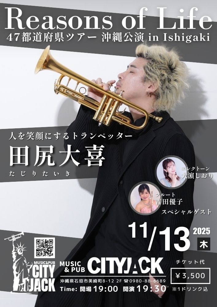 ★横目大翔 ぼぉのおと2 レコ発ツアー in 石垣島CITY JACK・開場:19時/開演:19時30分・出演=横目大翔 (Vo․Ba․一五一会)、松村雅大 (Gui)、大嶺友里奈 (三線)、東川平翔大 (Dr)・ゲスト:比嘉舜太朗・ココノハ・会場=石垣島・MUSIC & PUB CITY JACK会場
