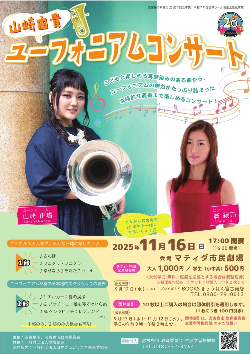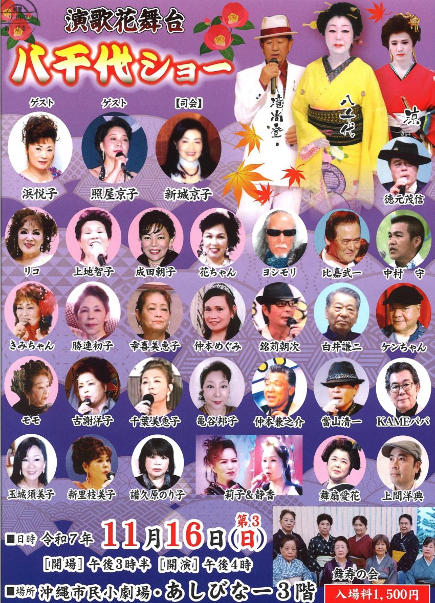 ★宮園ゆうこ コンサート・開場:15時/開演:15時30分・出演=宮園ゆう子(ビクターエンタテイメント)、半田浩二(テイチクレコード)、ゲスト:浜悦子・木村悟、会主・一条玉峰、砂川順子、蓮、金城美智子、田口純、KAMEパパ、岸本蓉子、我如古ゆう、万政夫、山ちゃん、仲地重和、創作舞踊彩女乃会、会主・不二乃彩女、銘苅美幸&下條千夏、一華、会主宗山流 江、会主上道、ちあき&武男・司会 成田なり子・会場=アイム・ユニバースてだこホール・大ホール