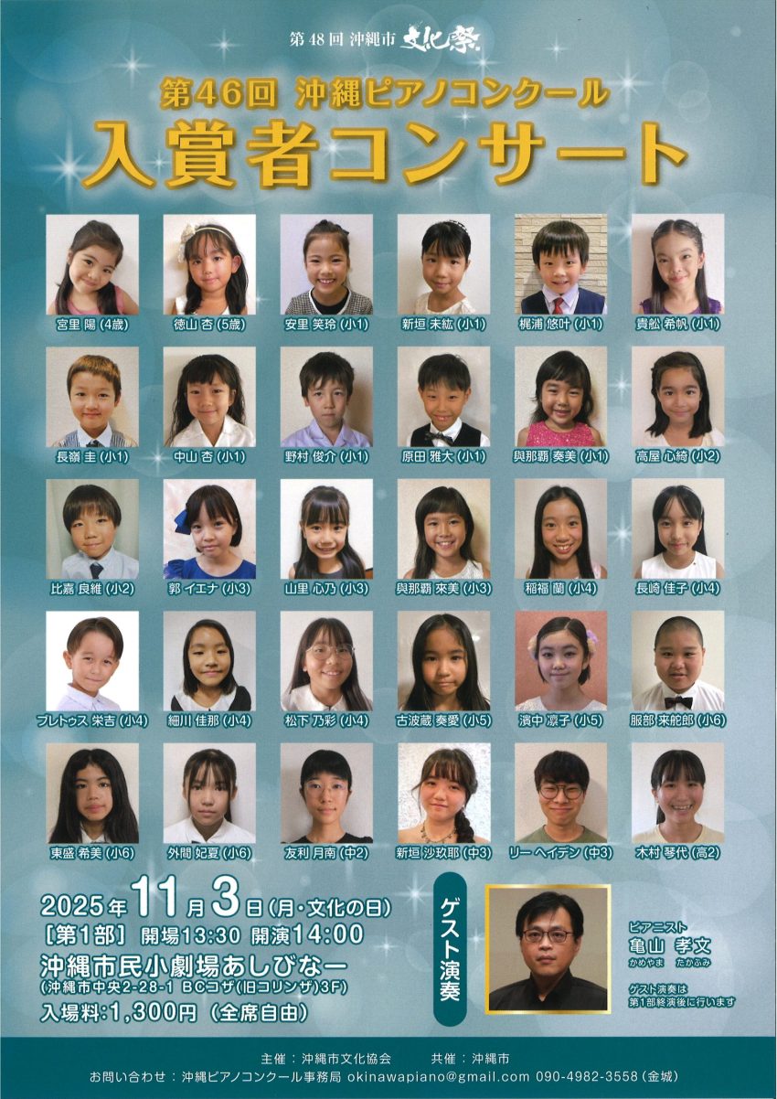 ★第46回沖縄ピアノコンクール 入賞者コンサート・【1部】開場:13時30分/開演:14時・【2部】開場:16時30分/開演:17時・会場=沖縄市民小劇場あしびなー