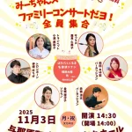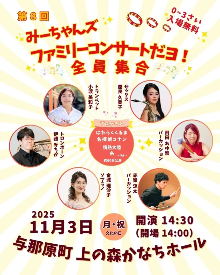 ★第8回 みーちゃんズファミリーコンサートだヨ! 全員集合・開場:14時/開演:14時30分・出演=小渡美和子:トランペット、屋良久美子:サックス、飛田あゆ梨:パーカッション、伊禮みちか:トロンボーン、赤嶺涼太:パーカッション、金城理沙子:ソプラノ・会場=与那原町上の森かなちホール(与那原町上与那原16)