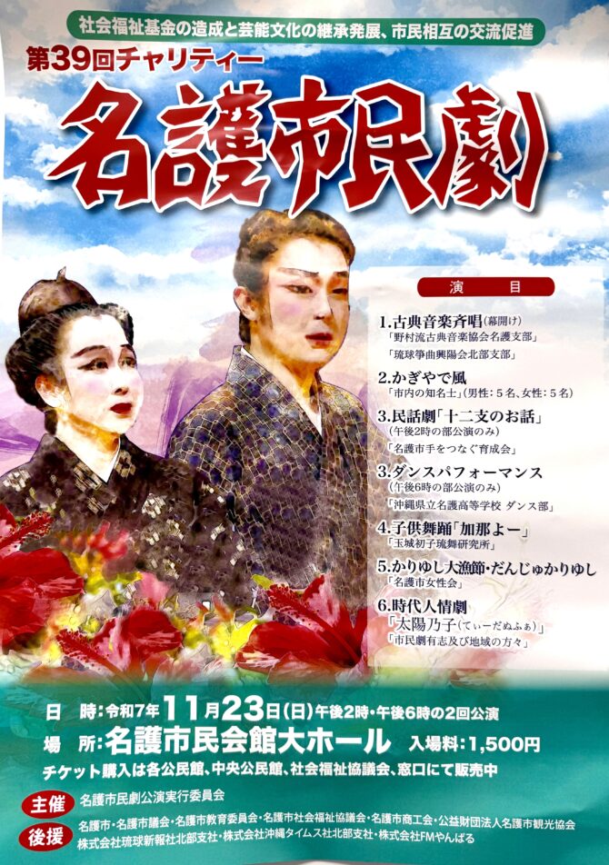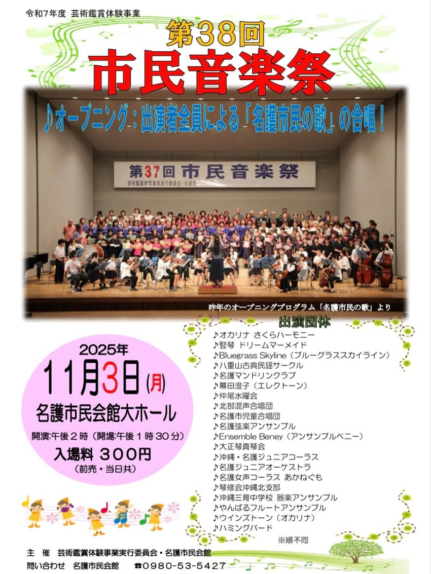 ★名護市第38回市民音楽祭・開場:13時30分/開演:14時・出演団体=オカリナさくらハーモニー、竪琴 ドリームマーメイド、Bluegrass Skyline(ブルーグラススカイライン)、ハ重山古典民謡サークル、名護マンドリンクラブ、幕田澄子(エレクトーン)、仲尾水曜会、名護市民会館大ホール、北部混声合唱団、名護市児童合唱団、名護弦楽アンサンブル、Ensemble Beney(アンサンブルベニー)、大正琴真琴会、沖縄·名護ジュニアコーラス、名護ジュニアオーケストラ、名護女声コーラス あかねぐも、琴修会沖縄北支部、沖縄三育中学校 器楽アンサンブル、やんばるフルートアンサンブル、ウインズトーン(オカリナ)、ハミングバード・会場=名護市民会館・大ホール
