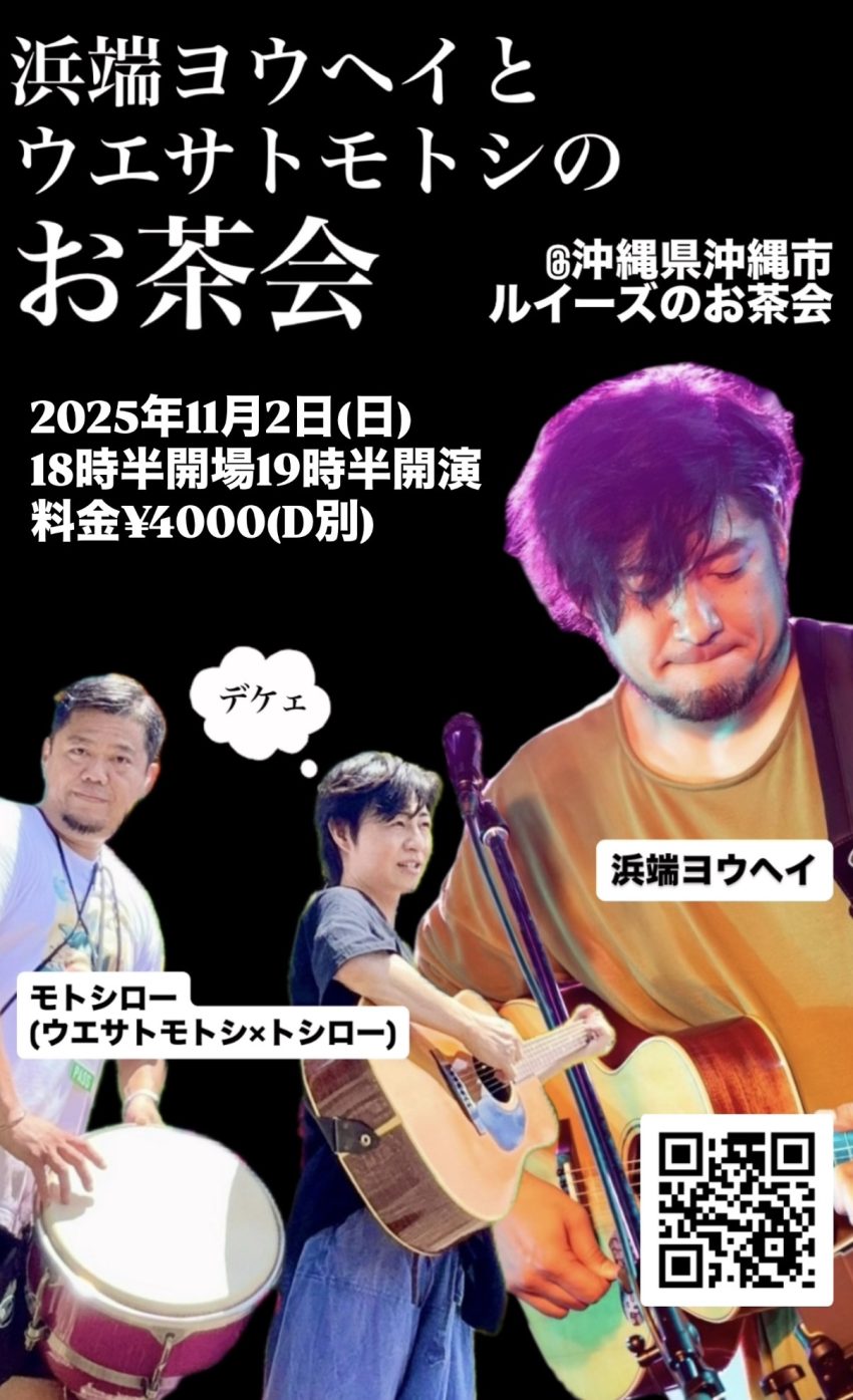 ★浜端ヨウヘイ×ウエサトモトシのお茶会・開場:18時30分/開演:19時30分・出演=浜端ヨウヘイ、モトシロー(ウエサトモトシ&トシロー)・会場=ルイーズのお茶会(縄市住吉2丁目26−27 26番27号 2階)