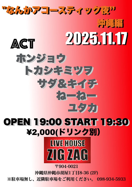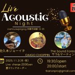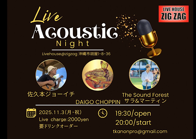 ★Acoustic Night・開場:19時30分/開演:20時・出演=佐久本ジョーイチ、DAIGO CHOPPIN、The Sound Forest(サラ&マーティン)・会場=ライブハウスZIGZAG