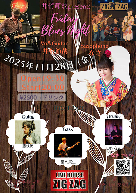 ★FridayBluesNight・開場:19時30分/開演:20時・出演=Vo&Guitar:井板節哉、Saxophone:なさ、Guitar:藤枝暁、Bass:里久実生、Drums:山内之人・会場=ライブハウスZIGZAG