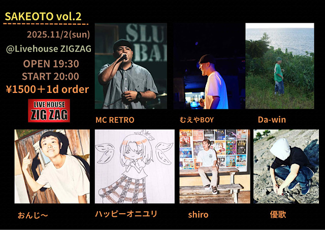 ★ラップイベント SAKEOTO Vol.2・開場:19時30分/開演:20時・出演=MC RETRO、むえやBOY、Da-win、おんじ〜、ハッピーオニユリ、shiro、優歌・会場=ライブハウスZIGZAG