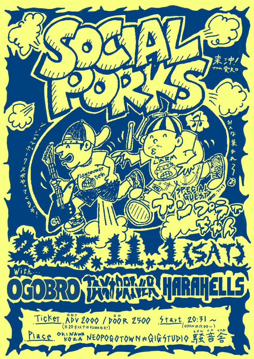★SOCIAL PORKS・開場:13時/開演:20時31分・ACT:SOCIAL PORKS (from愛知)、 ナンプラーちゃん(from 愛知) 、TAXI DRIBER、 OGOBRO、 HARAHELLS・会場=騒音舎(沖縄市 中央2丁目7-37 2F NEO POGOTOWN)