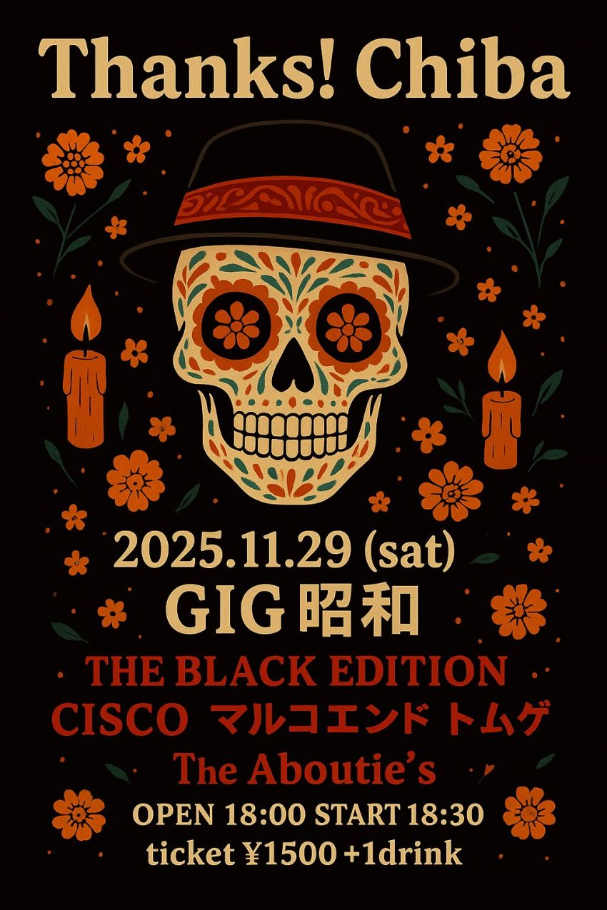 ★チバユウスケ追悼ライブ Thanks!Chiba・開場:18時30分/開演:19時・出演=THE BLACK EDITION、CISCO、マルコエンド、トムゲ、 The Aboutie’s・会場=GIG昭和(那覇市泊3-7-14 国際貿易ビルB1F)
