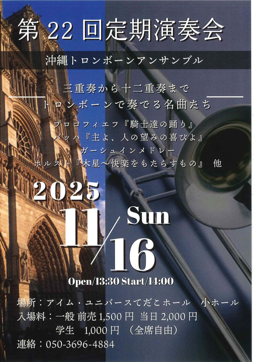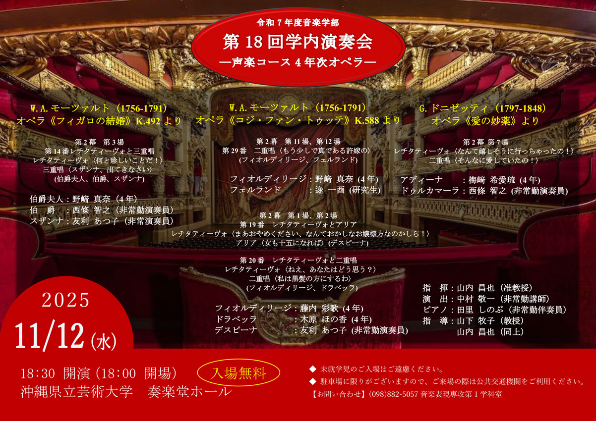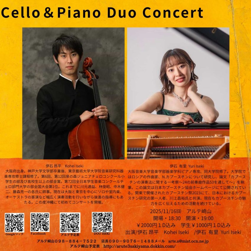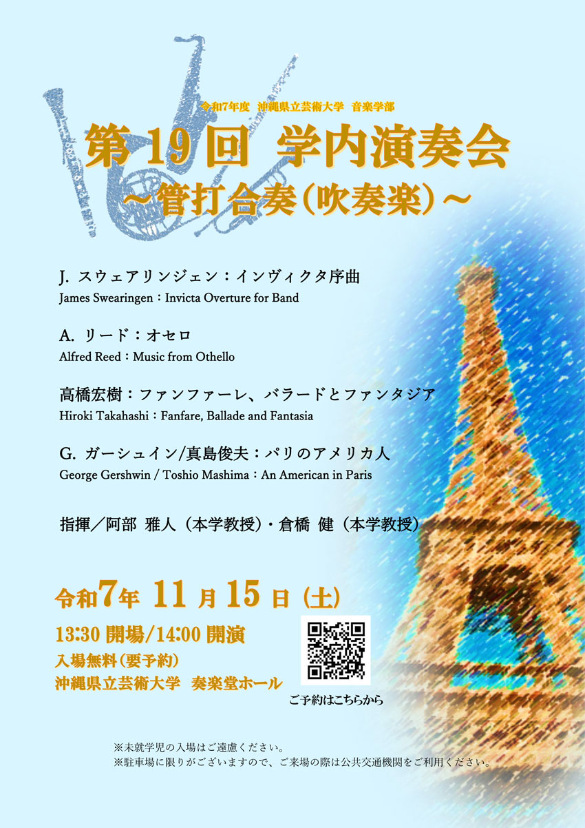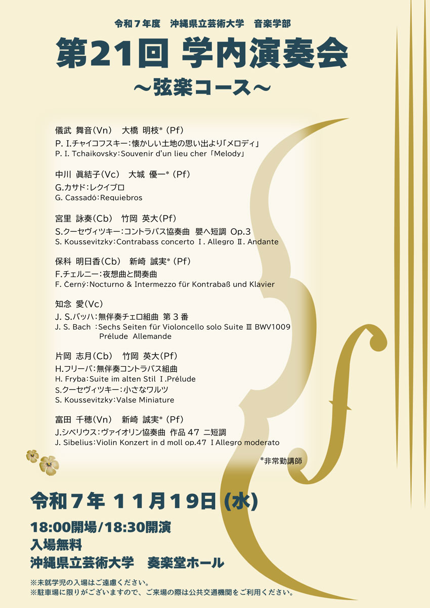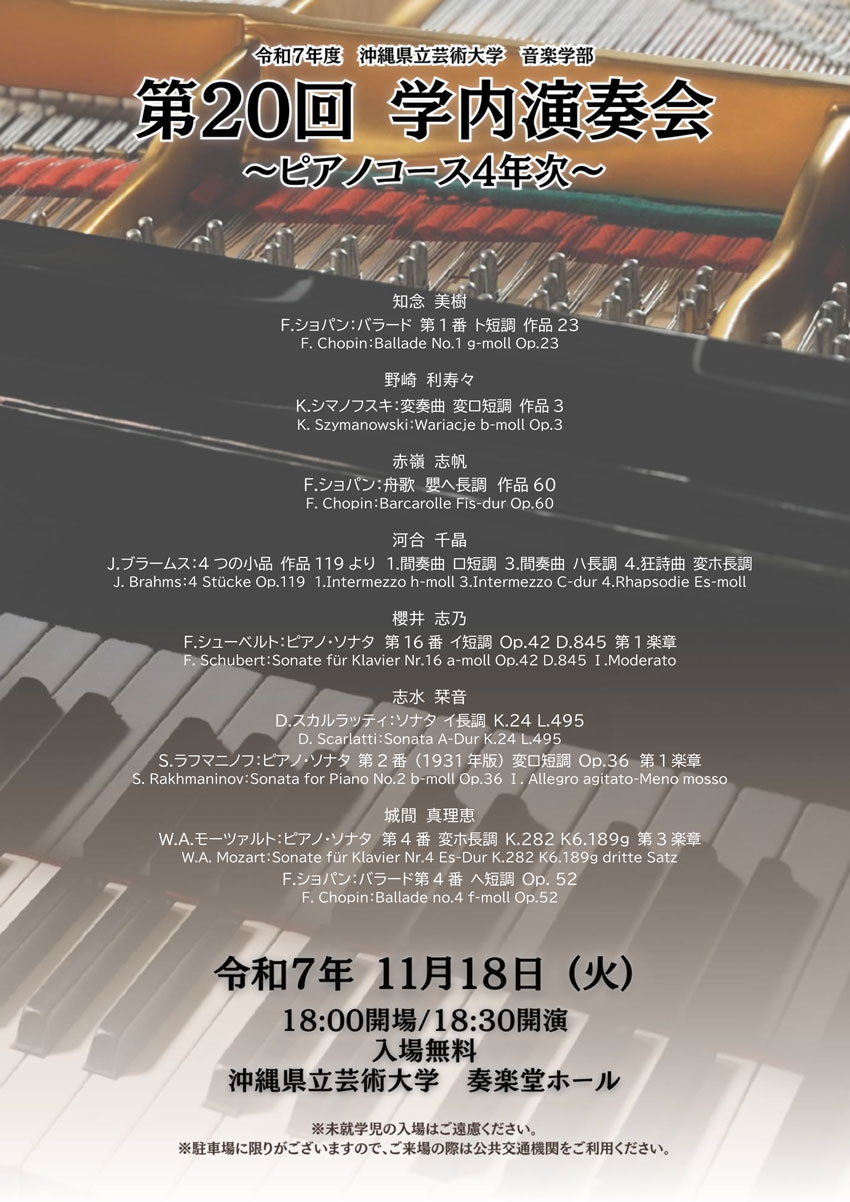 ★沖縄県立芸術大学音楽学部・第22回学内演奏会 ―1、2年次重奏―・開場:18時/開演:18時30分・出演=桃原あき(1年)、大田倖綾(1年)、穂積隼太(1年)、大道結野(1年)、正本乃愛(1年)、三瓶心(1年)、兵頭陸(1年)、新垣結菜(1年)、本田采那(2年)、新城一大(院1)、横田美羽(2年)、池原啓(2年)、中村倫(2年)、新川真子(2年)・内容=ピアノ重奏・会場=沖縄県立芸術大学奏楽堂ホール(首里当蔵キャンパス)