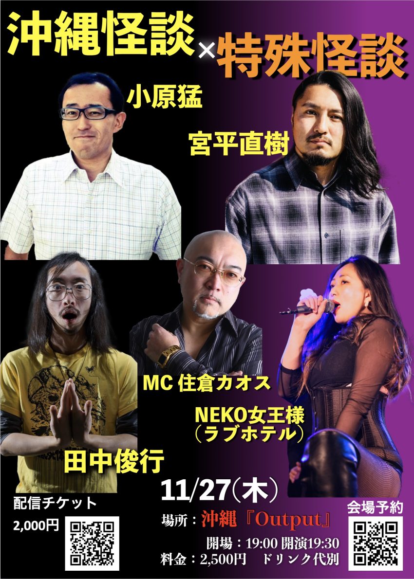 ★沖縄怪談 × 特殊怪談・開場:19時/開演:19時30分・出演=小原猛(作家) 宮平直樹(かりゆし58) 田中俊行(オカルトコレクター) 住倉カオス(シビレクラブ) NEKO(ラブホテル) ・会場=ライブハウスoutput