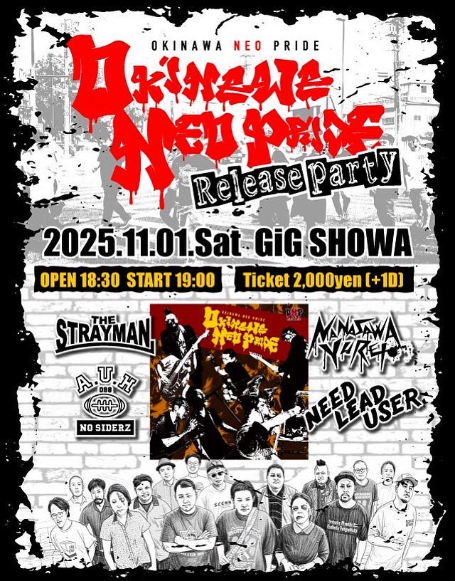 ★OKINAWA NEO PRIDE リリースパーティ・開場:18時30分/開演:19時・出演=A.U.H 、七騒ユーレイ、 THE STRAYMAN、 NEED LEAD USER・会場=GIG昭和(那覇市泊3-7-14 国際貿易ビルB1F)
