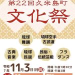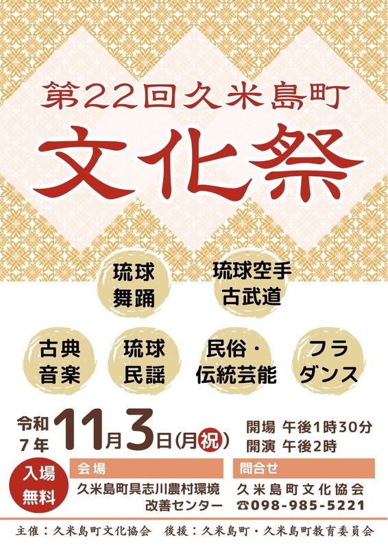 ★第22回久米島町文化祭・開場:13時30分/開演:14時・プログラム=琉球舞踊、琉球空手古武道、古典音楽、琉球民謡、伝統芸能民俗、フラダンス・会場=久米島町具志川農村環境改善センター(久米島町仲泊730)