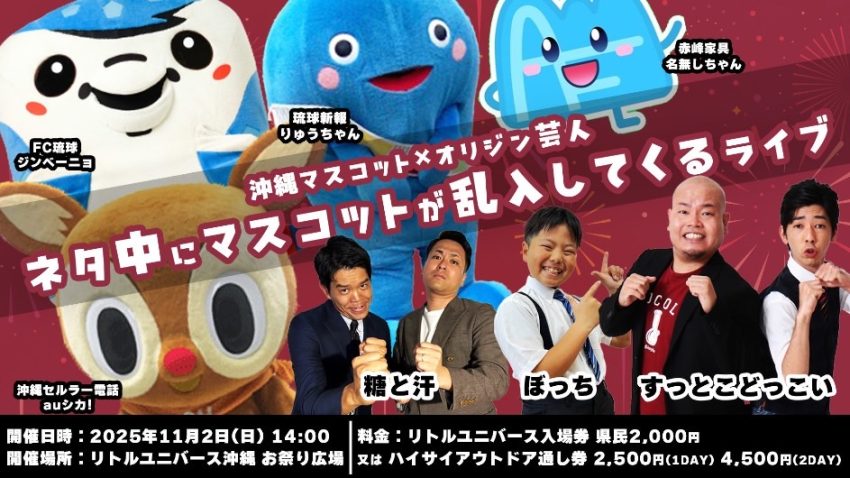 ★沖縄マスコット×オリジン芸人 ネタ中にマスコットが乱入してくるライブ!・開演:14時・出演=すっとこどっこい、ぼっち、糖と汗・会場=リトルユニバース沖縄 お祭り会場