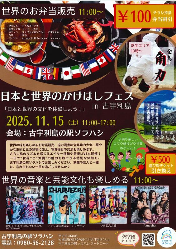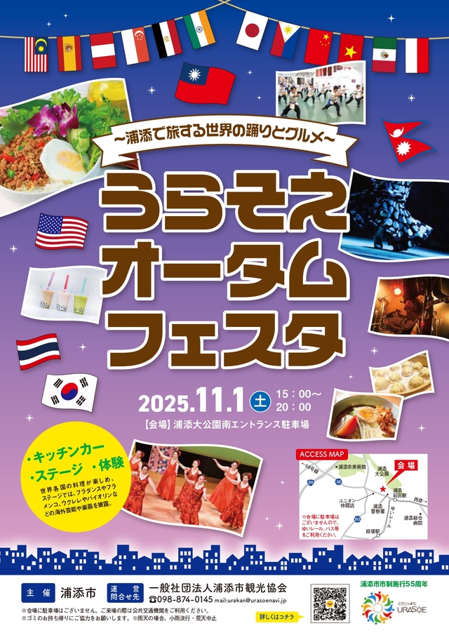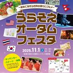 ★うらそえオータムフェスタ~浦添で旅する世界の踊りとグルメ~・主なステージプログラム=15時20分~:キッズダンス・バイオリン、15時40分~:ネパールダンス、16時~:台湾ダンス、16時20分~:太極拳、16時45分~:フラダンス、17時05分~:ウクレレ、18時~:ダンスメドレー (サルサ・ズンバ・キッズ)、18時40分~:フラメンコ、19時10分~:ライブ・会場=浦添大公園南エントランス駐車場(浦添市仲間2-49-49)