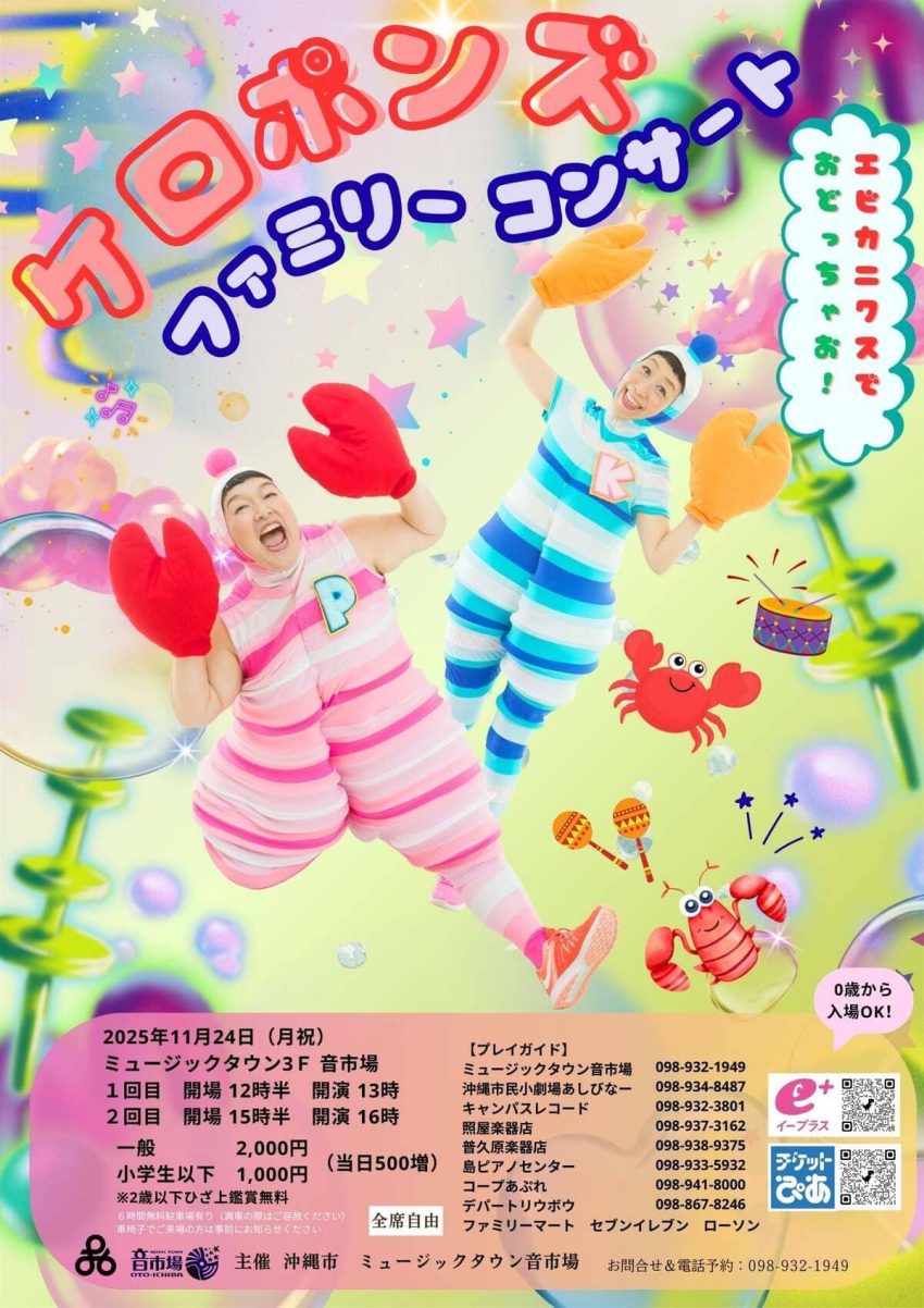 ★ケロポンズ ファミリーコンサート・【1回目】開場:12時30分/開演:13時・【2回目】開場:15時30分/開演:16時・出演=ケロポンズ・会場=ミュージックタウン音市場