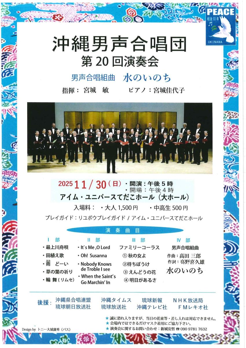 ★沖縄男声合唱団 第20回演奏会・開場:16時/開演:17時・指揮:宮城敏・ピアノ:宮城佳代子・会場=アイム・ユニバースてだこホール大ホール