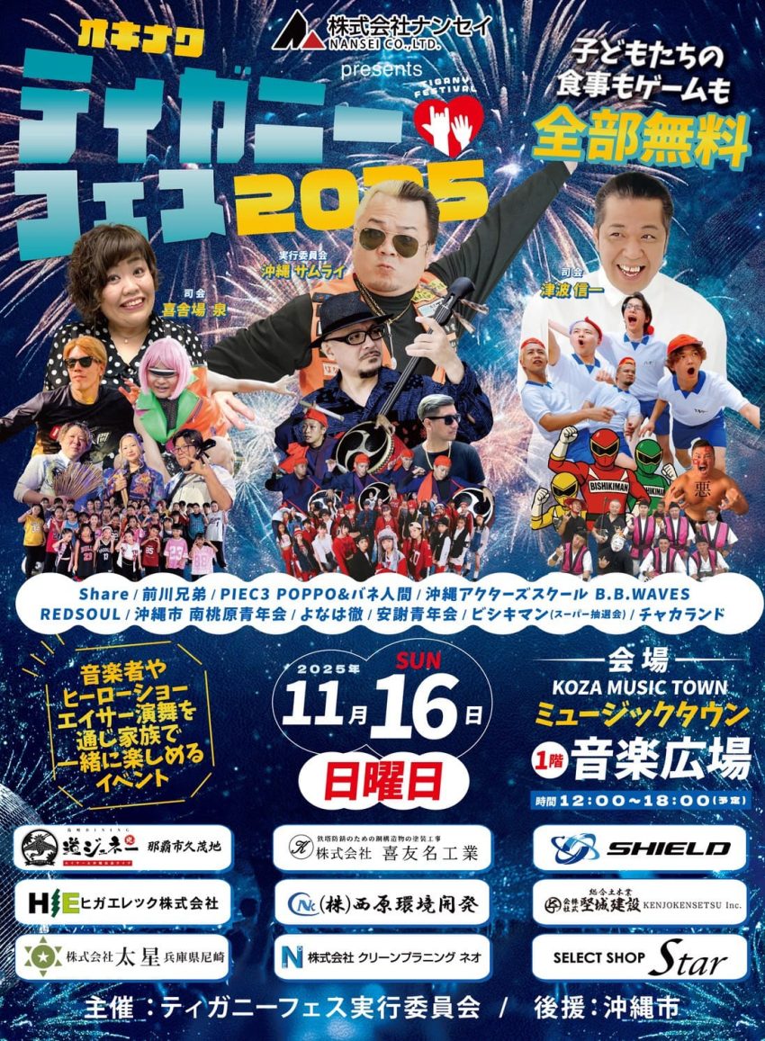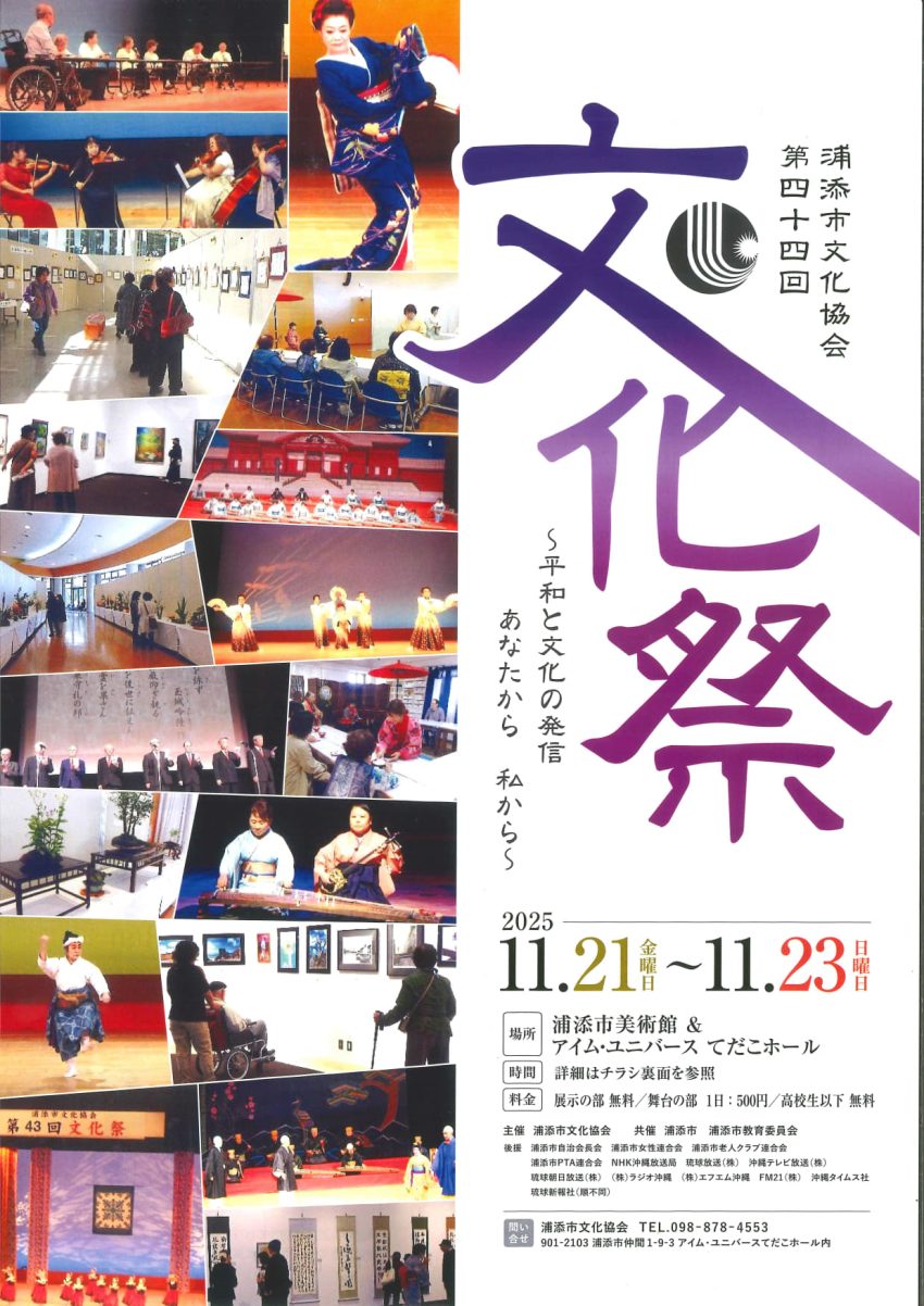 ★令和7年度第21回うるま市産業まつり・ステージプログラム・12時25分~:宜壽次采玖(第9回U-18島唄者コンテスト優秀賞 )・13時: dance studio FREEs・13時30分~・ありんくりんステージ・14時20分~・Ayapanda &こどもサザンダンサーズ・14時40分~:しまくとうば音楽ライブ/奏絵・会場=イオン具志川店・2階イベント広場