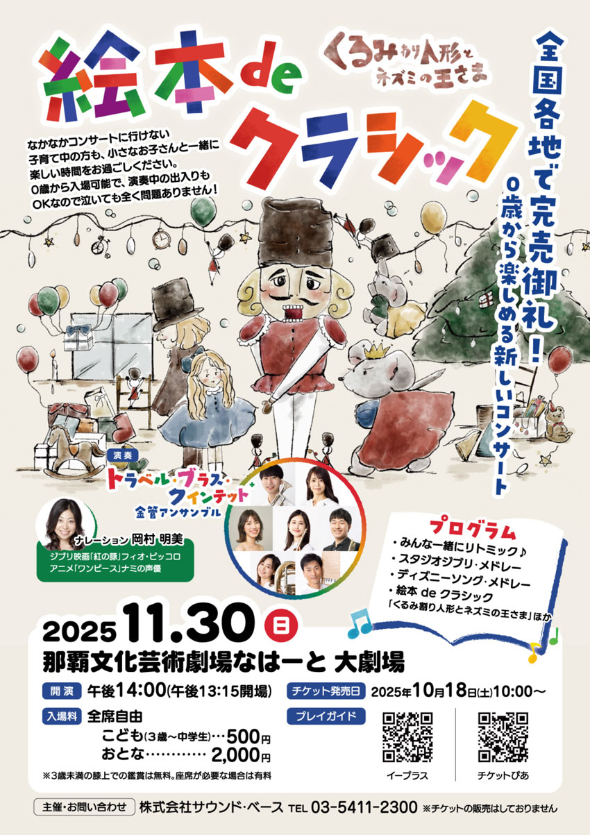 ★絵本 de クラシック「くるみ割り人形とネズミの王さま」・開場:13時15分/開演:14時・出演=トラベル・ブラス・クインテット+(金管アンサンブル):曽根麻央(トランペット)、只友佑季(トランペット)、佐藤杏子(ホルン)、山下純平(トロンボーン)、四條由紀子(チューバ)、青山政憲(作曲・ピアノ)、日野真奈美(フルート)・岡村明美(朗読)・会場=那覇文化芸術劇場なはーと・大劇場