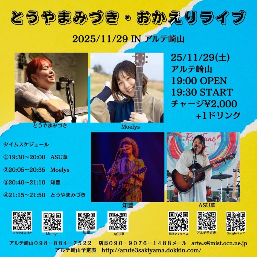 ★とうやまみづき・おかえりライブ・開場:19時/開演:19時30分・出演=とうやまみづき/Moelys/知豊/ASU華・会場=アルテ崎山