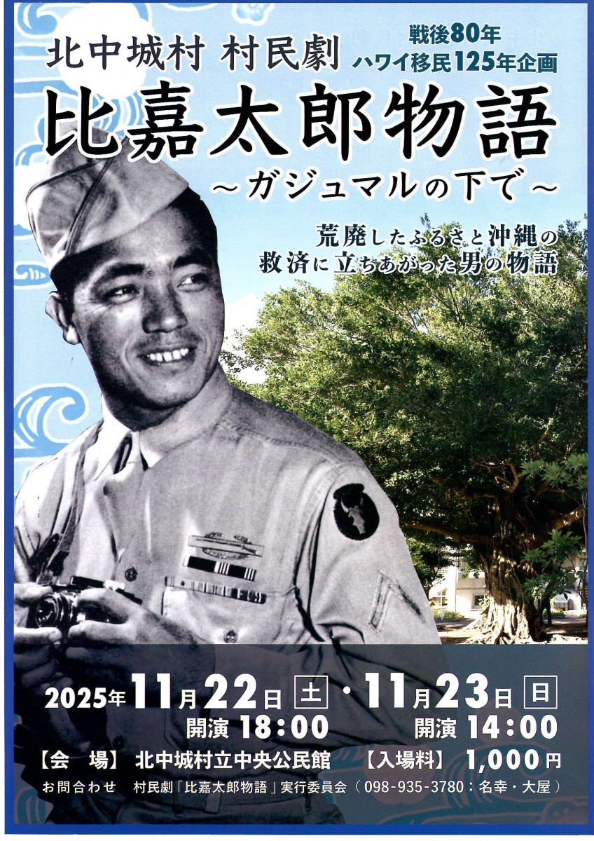 ★作・大宜見小太郎「ハワイ行進曲」・【午前の部】開場:10時30分/開演:11時・【午後の部】開場:14時30分/開演:15時・第一部=舞踊二題、現代劇:心打つ波・出演=奥平由依、高宮城実人、新垣正弘、宇座仁一、玉城匠、知念亜希、金城真次・第二部=ハワイ行進曲:出演=犬養憲子、奥平由依、玉城匠、高宮城実人、伊禮門綾、嘉数道彦・城間やよい、金城忍、他総出演・会場=国立劇場おきなわ・小劇場
