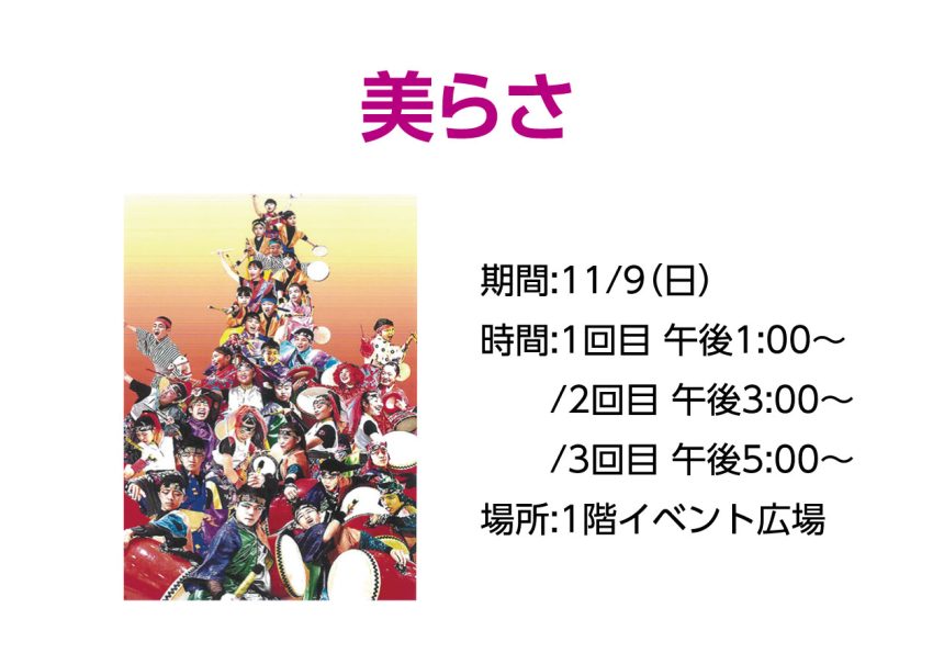 ★沖縄ちむドン!演舞祭・14時~17時・14時~:トークショー=~沖縄の伝統文化の大切さを伝える~・15時~:エイサー・演舞など・会場=沖縄アウトレットモールあしびなー(あしびなー広場)