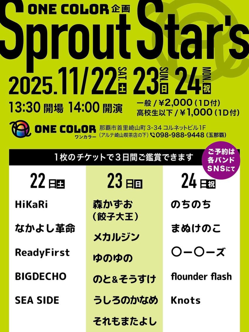 ★ONE COLOR企画・Sprout Star’s Vol.8・開場:13時30分/開演:14時・出演=のちのち、まぬけのこ、〇ー〇ーズ、flounder flash、Knots・会場=ONE COLOR(那覇市首里崎山町3丁目34 コルネットビル1F)