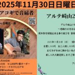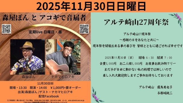 ★森屋ぽんとアコギで音届者・開場:13時30分/開演:14時・出演=森屋ぽん・ゲスト/ヒロアキ・会場=アルテ崎山
