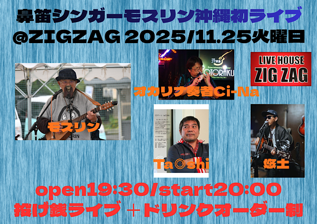 ★鼻笛シンガーモスリン 沖縄初ライブ・開場:19時30分/開演:20時・出演=リナ奏者Ci-Na、モリスン、Ta◎shi、您士・会場=ライブハウスZIGZAG