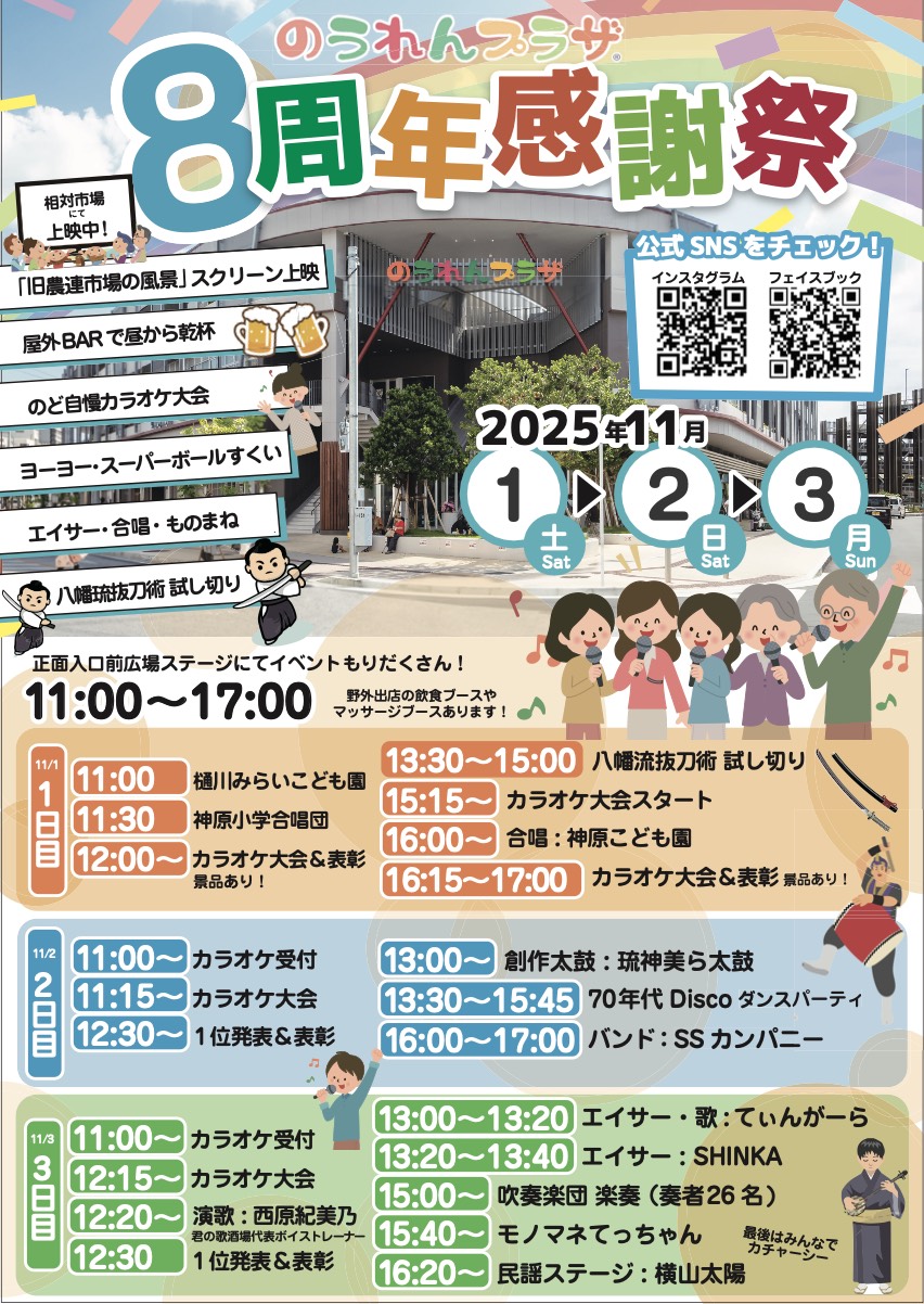 ★のうれんプラザ 8周年感謝祭・11時~17時・出演=エイサー・歌: てぃんがーら、エイサー: SHINKA、吹奏楽団 楽奏(奏者26名)、他・会場=のうれんプラザ(那覇市樋川2丁目3-1)