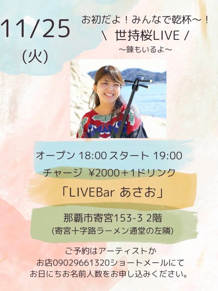 ★石垣島白保出身の唄者のパワフルな歌声をぜひお楽しみください♪・世持桜 唄三線ライブ・開場:18時/開演:19時・サポート:世持錬・会場=LIVE BAR あさお
