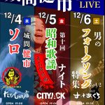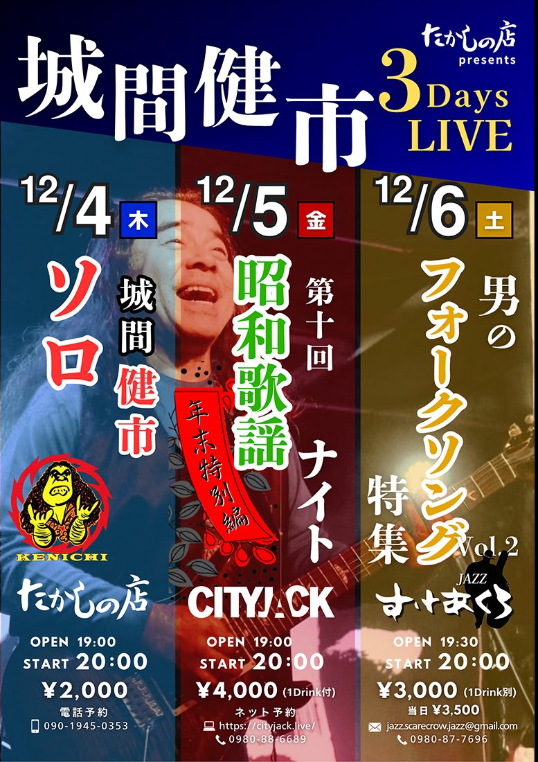 ★たかしの店Presents 城間健市 3DAYS LIVE @CITY JACK 第十回 昭和歌謡ナイト 年末特別編・開場:19時/開演:20時・会場=石垣島・MUSIC & PUB CITY JACK