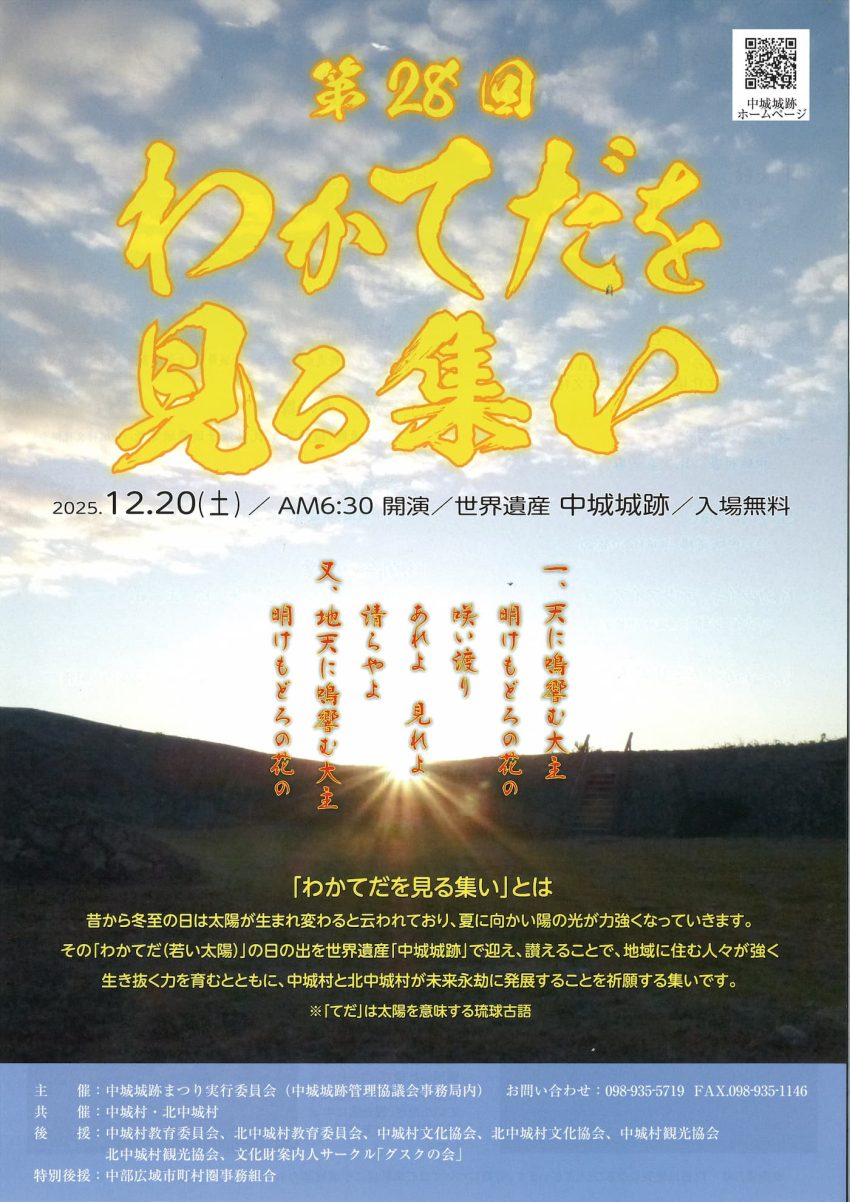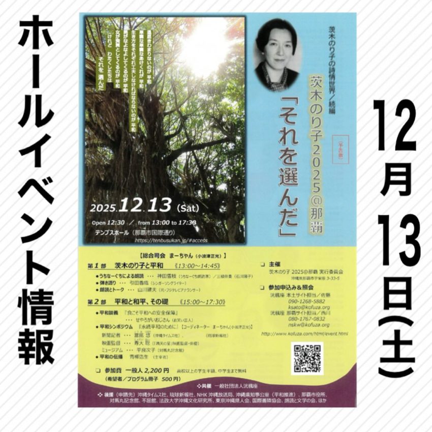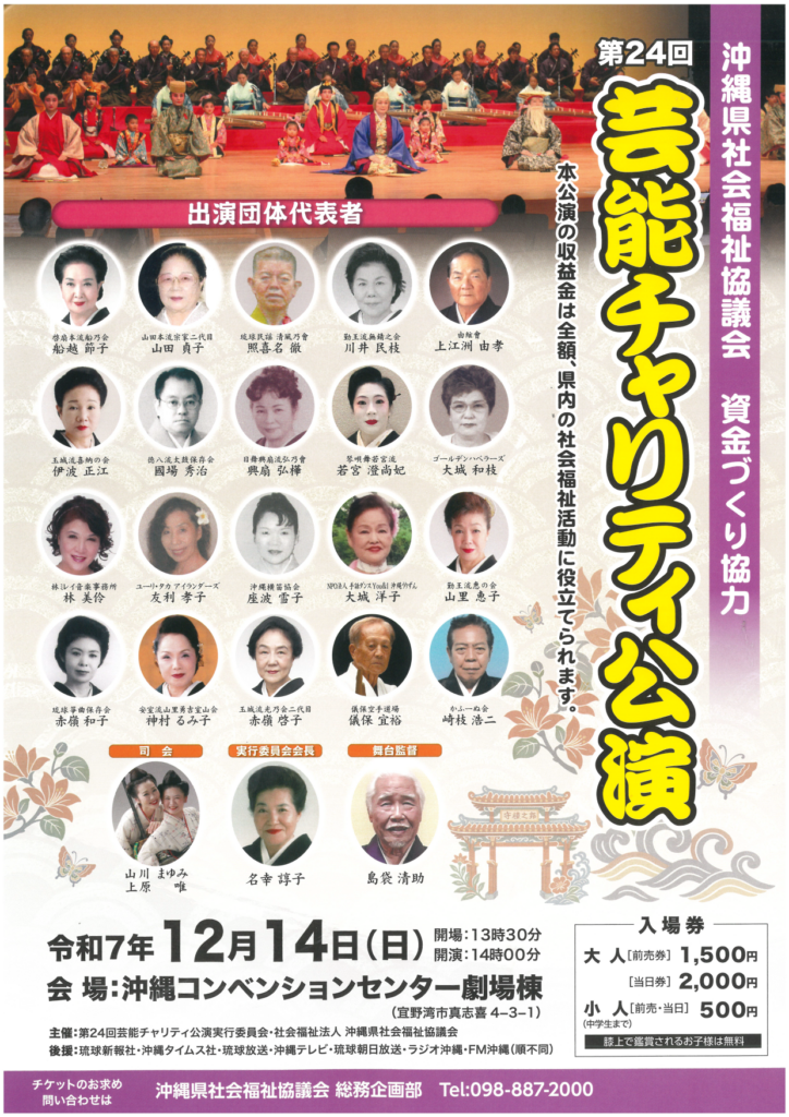 ★基金造成チャリティ公演・世界の海の安全と美しい海をと祈る塔建立 祐清丸遭難者 全海事遭難者 慰靈之碑開演:17時・出演=玉城千枝、宮良康正、浦崎永吉、宮良京男、山本、米蔵一正,来蔵昭子、本竹裕助、崎枝浩二、前業就秀夫、西治島則、長開辰夫、玉代勢式(安室流保存会沖縄支部)、伊良皆高吉、大城朝夫、久手堅一子(与那国民俗舞踊保存会)、川井民枝(動王流八重山伝統舞保存会無錯之会)、金城伊都子(親治流八重都仁の会、金城伊都子琉舞研究会)、鈴木智子、藏盛咲子、岡本正子、赤嶺弘子、根本良子、島袋、小林紀子他・会場=アイム・ユニバースてだこホール・大ホール