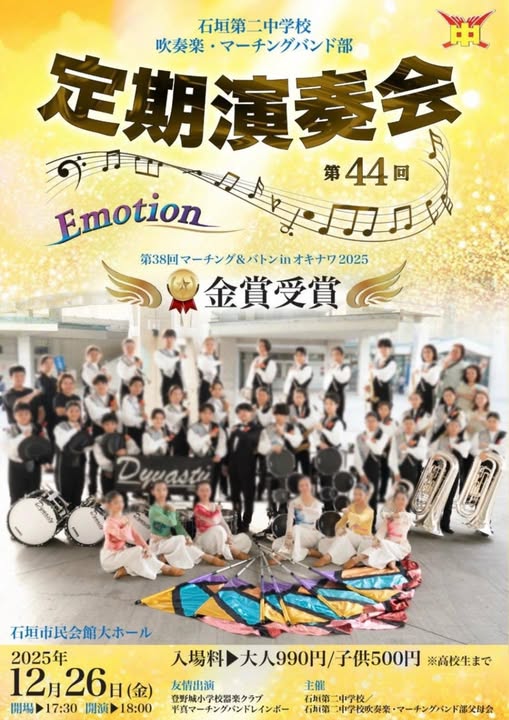 ★石垣第二中学校 吹奏楽・マーチングバンド部 第44回定期演奏会・開場:17時30分/開演:18時~終演:20時・会場=石垣市民会館・大ホール