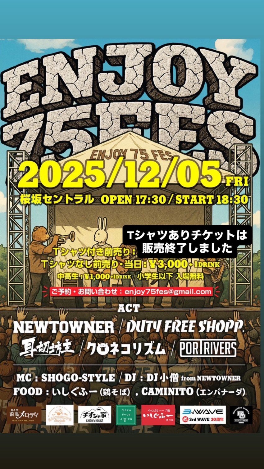 ★ENJOY 75 FES・開場:17時30分/開演:18時30分・出演=DUTY FREE SHOP、クロネコリズム、NEW TOWNER、耳切坊主、POP RIVERS・会場=桜坂セントラル