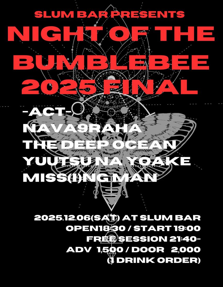 ★Night of the Bumblebee 2025 Final・開場:18時30分/開演:19時・ACT:NAVA9RAHA、THE DEEP OCEAN、YUUTSU NA YOAKE、MISS(I)NG MAN・会場=SLUM BAR