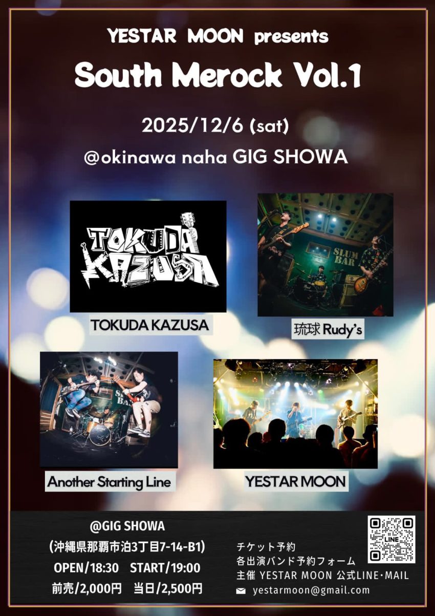 ★YESTAR MOON presents 「South Merock Vol.1」・開場:18時30分/開演:19時・出演=TOKUDD KAZUSA、琉球Rudy’s、Another Starting Line、 YESTAR MOON・会場=GIG昭和(那覇市泊3-7-14 国際貿易ビルB1F)