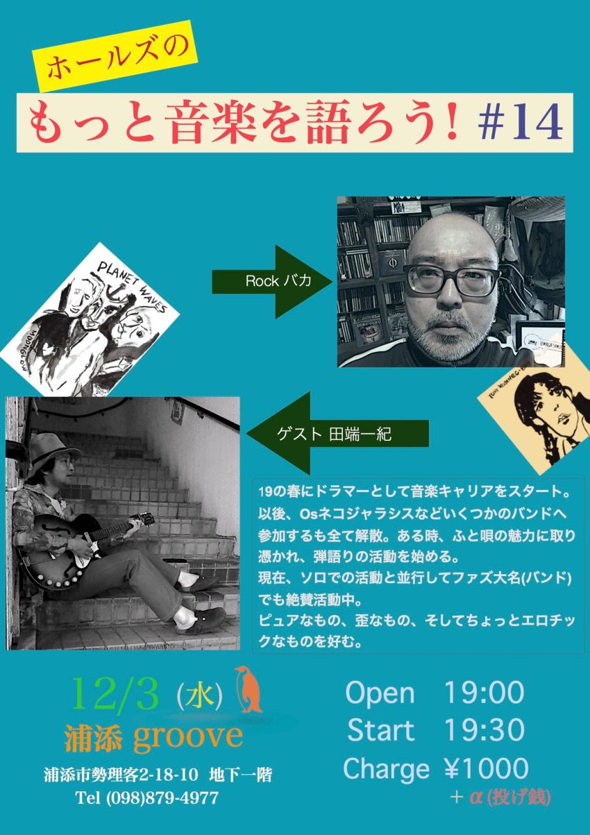 ★ホールズのもっと音楽を語ろう!#14・開場:19時/開演:19時30分・出演=ホールズ・ゲスト: 田端一紀・会場=groove