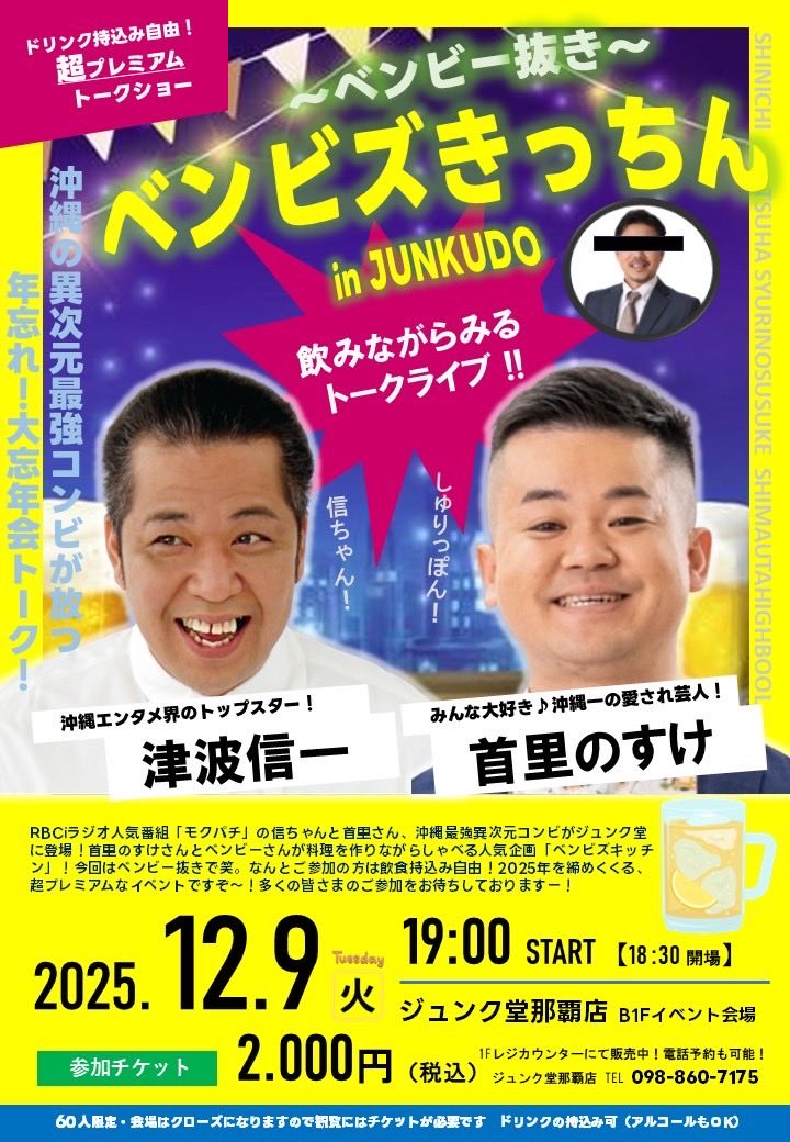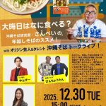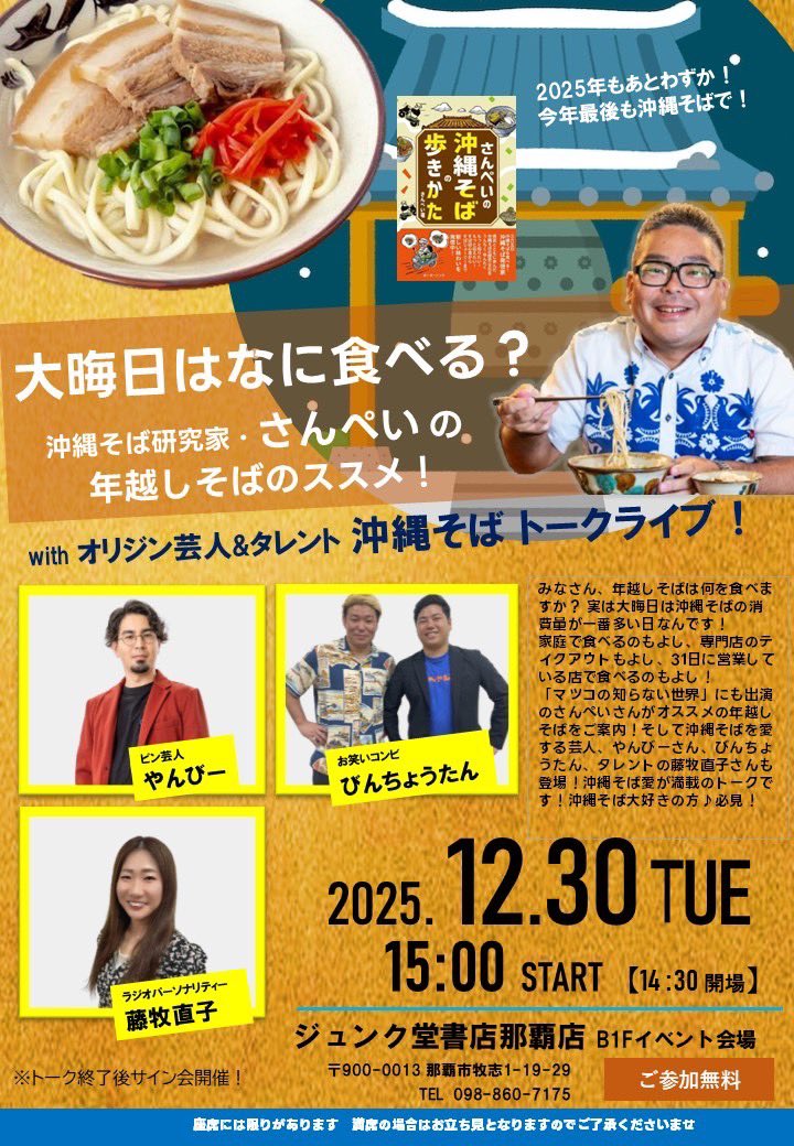 ★大晦日はなに食べる? 沖縄そば研究家・さんぺいの、年越しそばのススメ!with オリジン芸人&タレント 沖縄そば トークライブ!・開場:14時30分/START:15時・ピン芸人やんびー、お笑いコンビびんちょうたん、ラジオパーソナリティー藤牧直子・会場=ジュンク堂書店那覇店 B1Fイベント会場