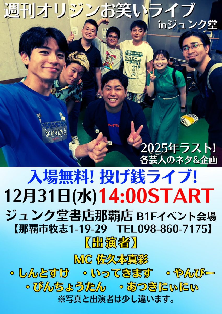 ★週刊オリジンお笑いライブ in ジュンク堂・開始:14時・出演=MC 佐久本真彩:しんとすけ、いってきます、やんぴー、びんちょうたん、あつきにぃにい・会場=ジュンク堂書店那覇店・B1Fイベント広場