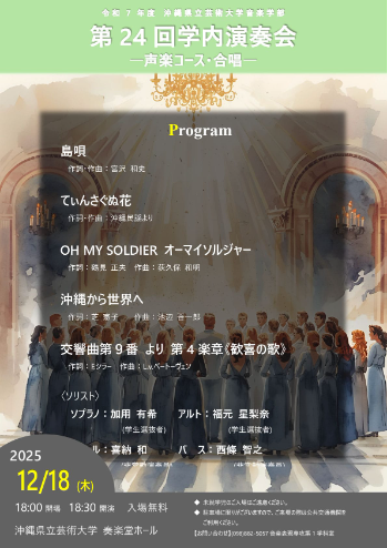 ★沖縄県立芸術大学音楽学部 第23回学内演奏会 ―大学院生によるコンチェルト―・開場:18時/開演:18時30分・出演=ヴァイオリン:富田千穂・指揮:岡田光樹(本学教授)、ピアノ:新城一大・指揮:林 裕(本学教授)、ピアノ:高江洲愛奏、指揮:江戸聖一郞(本学専任講師)・会場=沖縄県立芸術大学奏楽堂ホール(首里当蔵キャンパス)