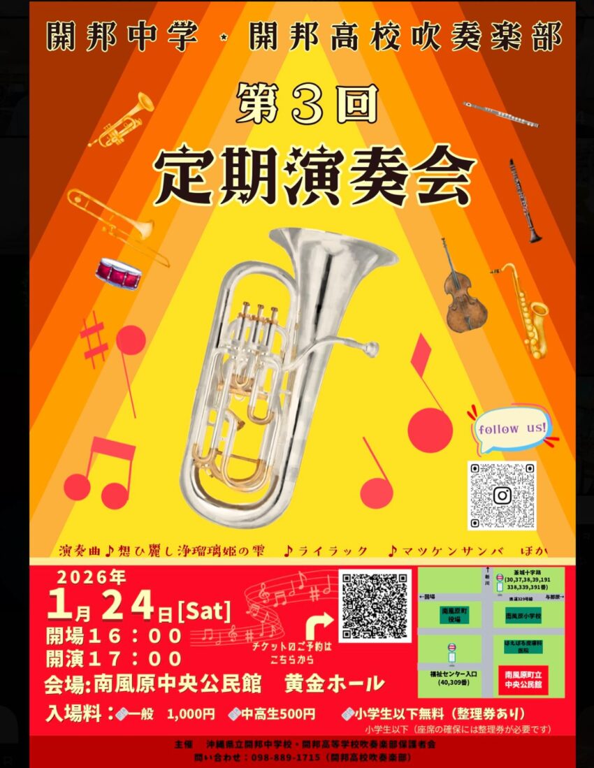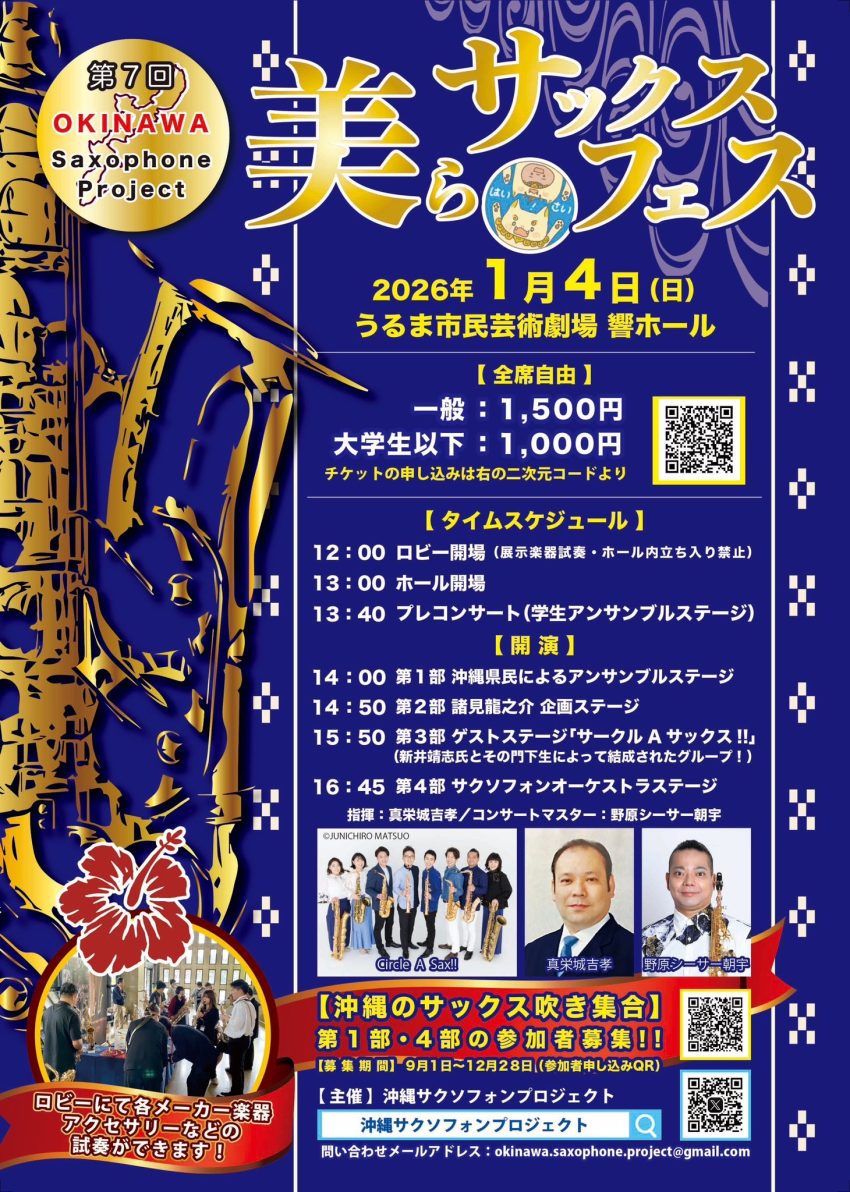 ★美らサックスフェス!2026・開演:14時・ 第1部 沖縄県民によるアンサンブルステージ・14時50分 第2部 諸見龍之介 企画ステージ・15時50分 第3部 ゲストステージ「サークルAサックス!!」(新井靖志氏とその門下生によって結成されたグループ!)・16時45分 第4部 サクソフォンオーケストラステージ・指揮:真栄城吉孝/コンサートマスター: 野原シーサー朝宇・会場=うるま市民芸術劇場・響ホール