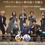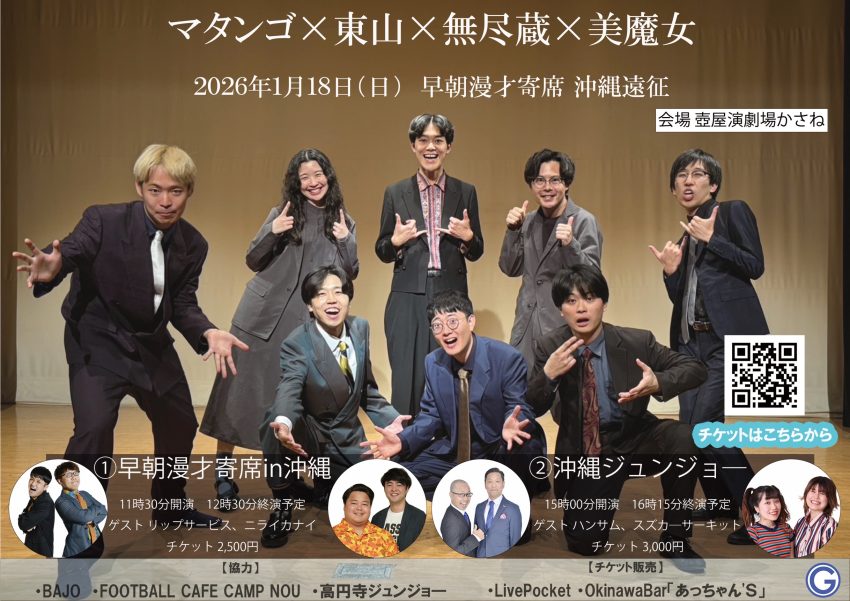 ★早朝漫才寄席 沖縄ジュンジョ―・【早朝漫才寄席in沖縄】開演:11時30分~終演:12時20分・出演=マタンゴ、無尽蔵、美魔女、東山・ゲスト:リップサービス、ニライカナイ・【沖縄ジュンジョ―】開演:15時~終演:16時15分・出演=マタンゴ、無尽蔵、美魔女、東山・ゲスト:ハンサム、スズカ―サーキット、他1.2組・会場=壺屋演劇場かさね
