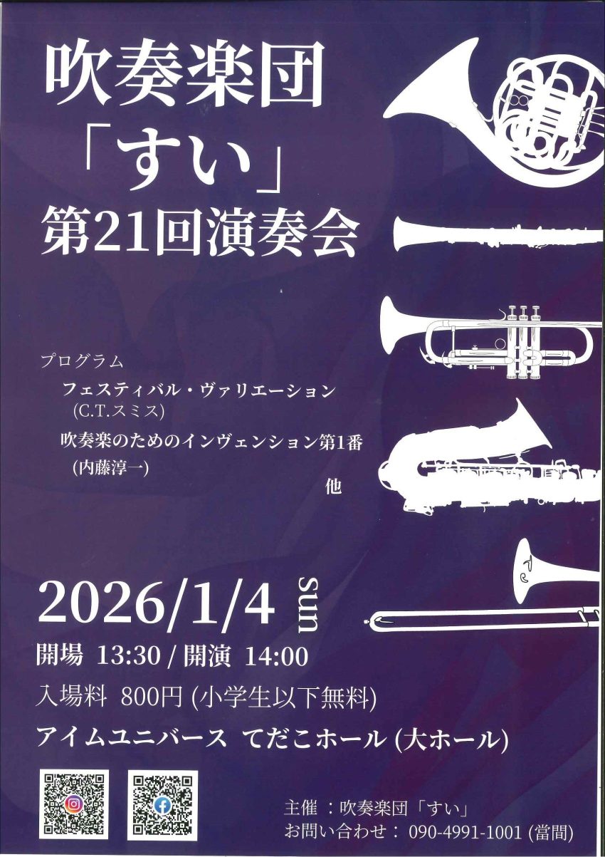 ★吹奏楽団「すい」 第21回演奏会・開場:13時30分/開演:14時・会場=アイム・ユニバースてだこホール・大ホール